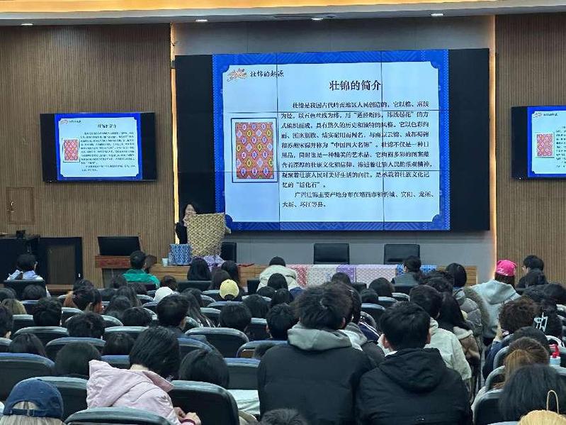 讲座中李老师指出,壮锦作为广西民族的文化符号,不仅承载着丰富的历史和文化信息,更是我们中华优秀传统文化的重要组成部分。随后她从壮锦技艺的起源、壮锦技艺的艺术特色、壮锦技艺的时代传承与发展等方面以理论讲解结合实物展示的方式,阐释壮锦技艺的工艺特点、色彩搭配、图案纹样、技艺流程,并分析讲解广西区内分布的宾阳壮锦、龙州壮锦、靖西壮锦及其织机的工作原理。参加讲座的师生纷纷表示受益匪浅,感受到传统文化的无穷魅力,结合设计学专业优势,积极尝试开展壮锦技艺的教育传承与创新研究,体悟壮锦非遗文化的独特魅力,推动民族文化与现代设计的融合发展,在实践中自觉增强民族自豪感和文化自信。